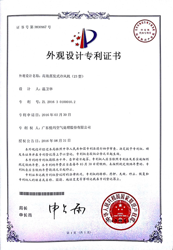 蒸發式冷氣機外觀設計專利證書2021-04-29 15:12:03   點擊:3118